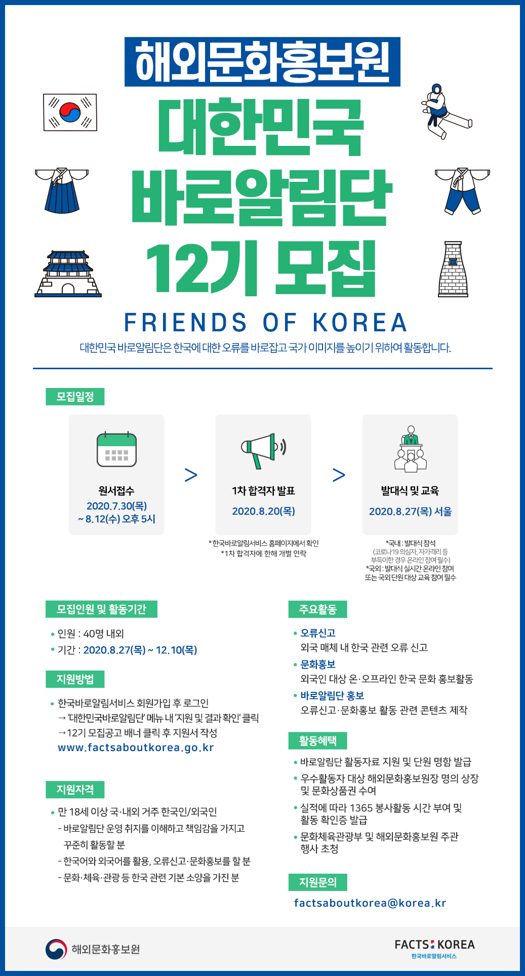 | 제목 | 제12기 '대한민국 바로알림단(Friends of Korea)' 모집 안내 | ||||