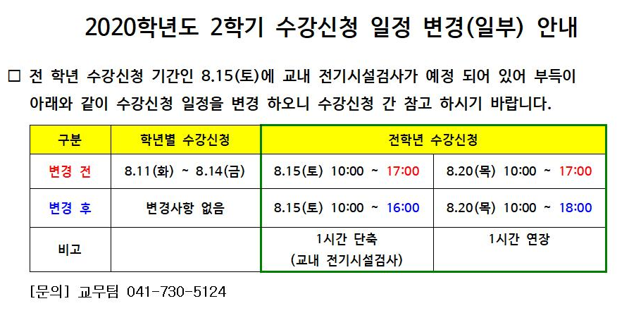 | 제목 | 2020학년도 2학기 수강신청 일정 변경(일부) 안내 | ||||