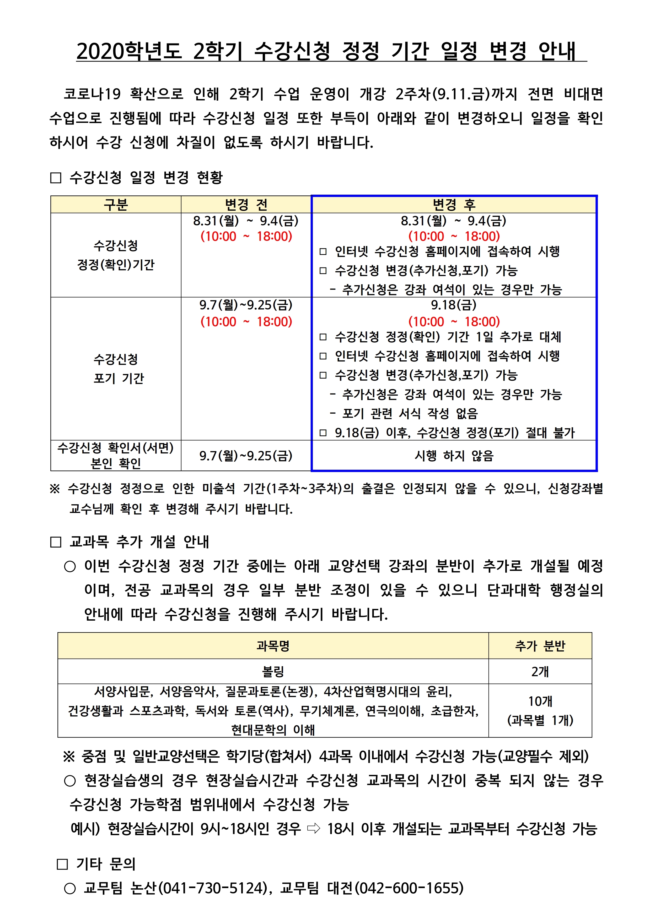 | 제목 | 2020학년도 2학기 수강신청 포기기간 일정 변경 안내 | ||||