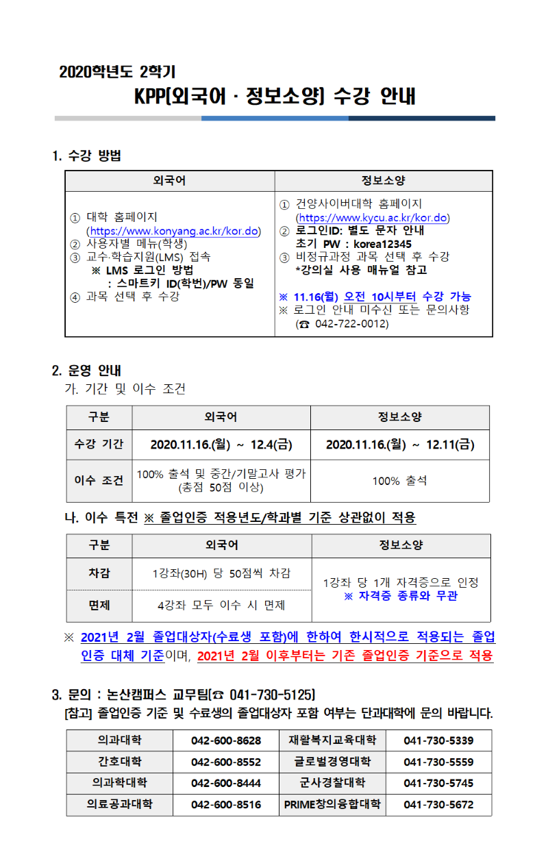 | 제목 | 2020학년도 2학기 KPP(외국어·정보소양) 수강 방법 안내 | ||||