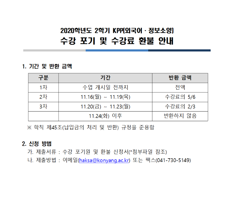 | 제목 | 2020학년도 2학기 KPP(외국어·정보소양) 수강 포기 및 수강료 환불 안내 | ||||