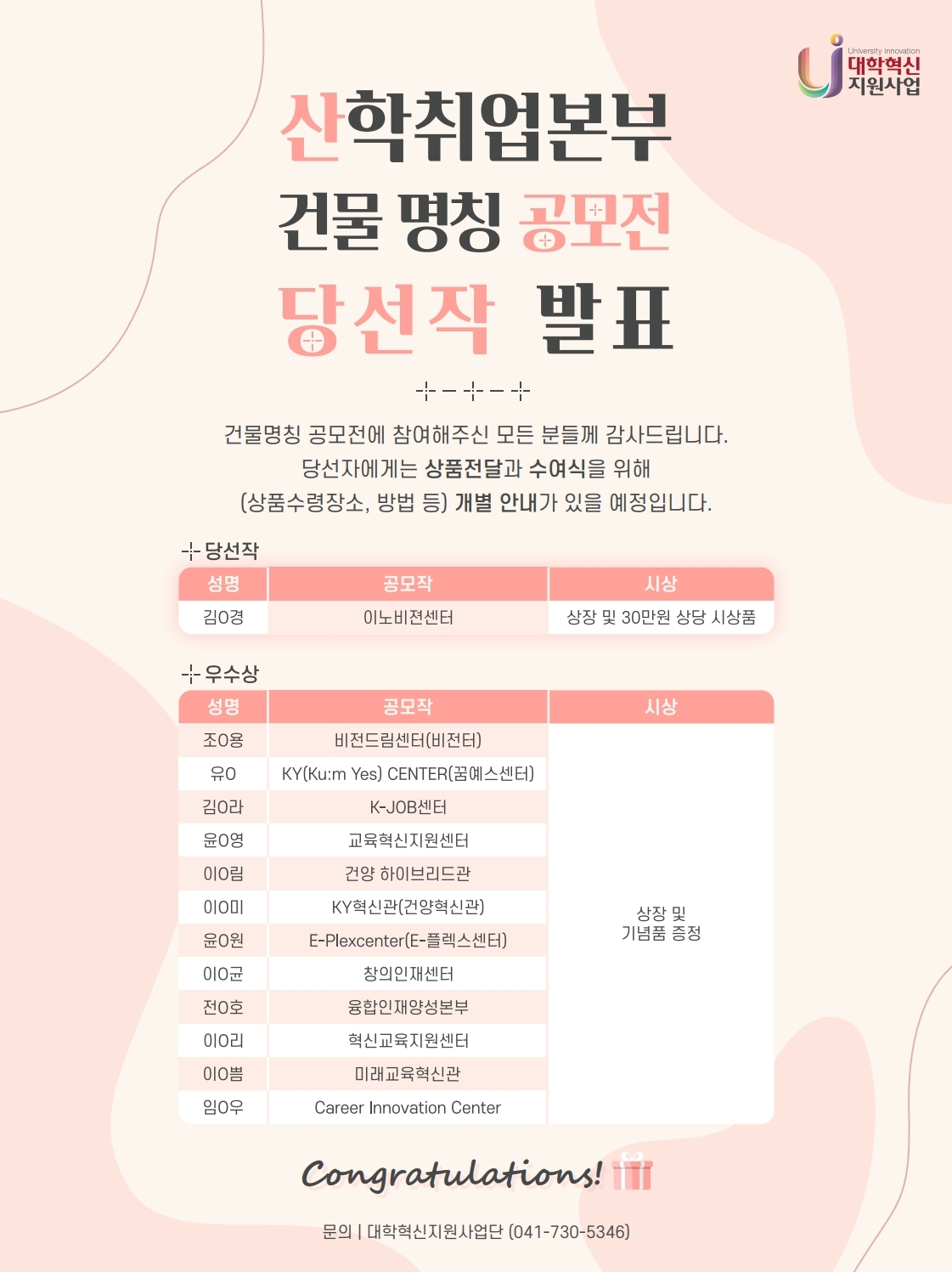 | 제목 | 산학취업본부 리모델링에 따른 건물 명칭 공모전 당선작 안내 | ||||