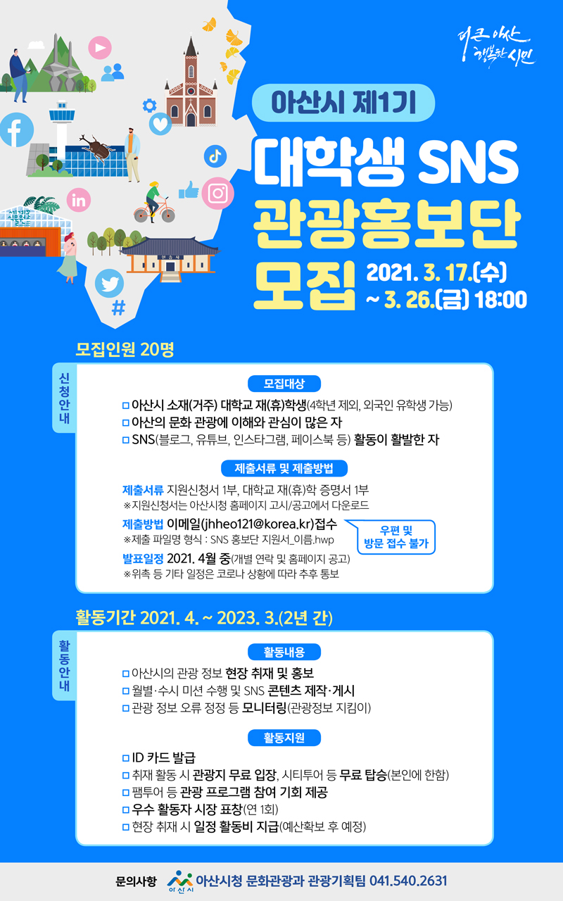 | 제목 | 아산시 제1기 대학생 SNS 관광홍보단 모집 안내 | ||||