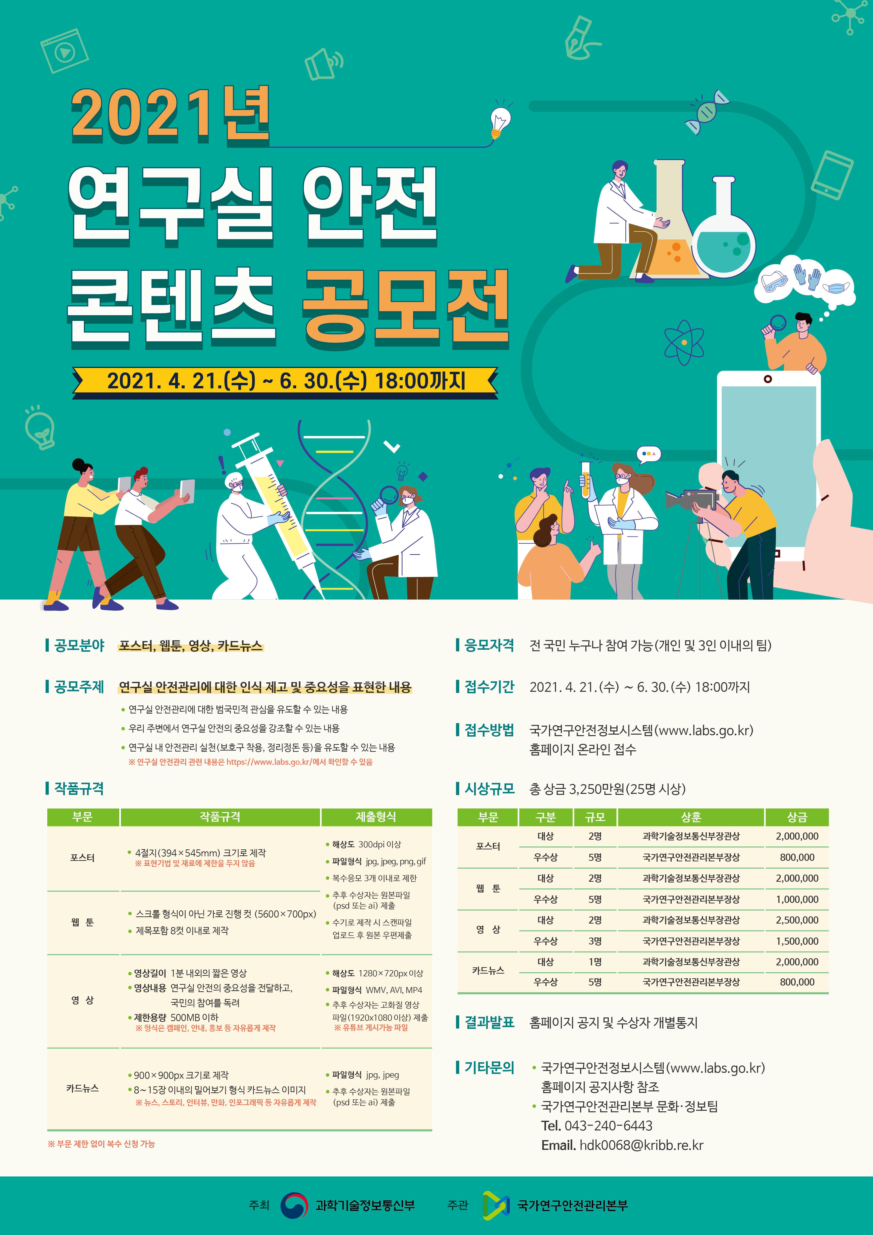| 제목 | 과학기술정보통신부 2021년 연구실 안전 콘텐츠 공모전 안내 | ||||