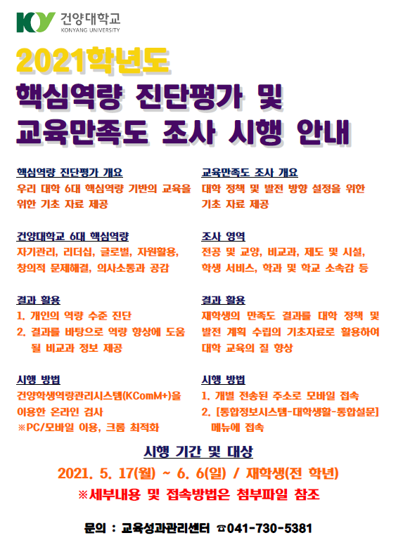 | 제목 | 2021학년도 핵심역량 진단평가 및 교육만족도 조사 시행 | ||||
