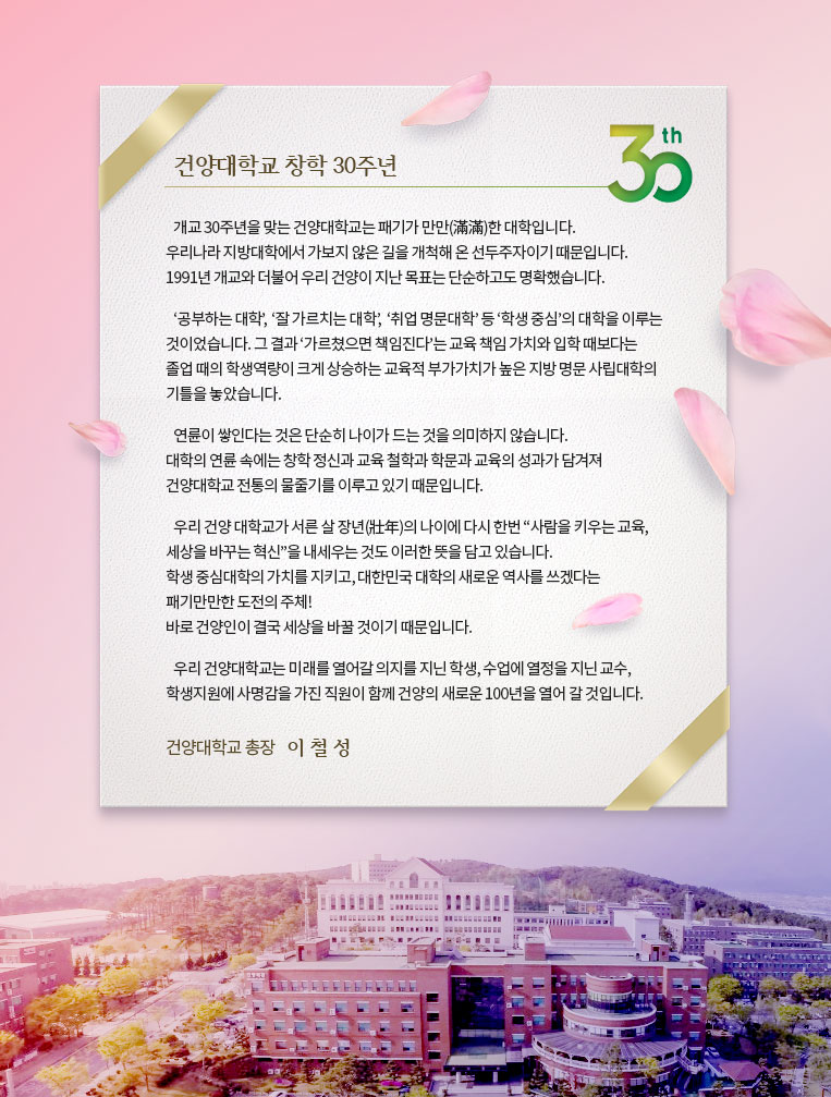 개교 30주년을 맞는 건양대학교는 패기가 만만(滿滿)한 대학입니다. 우리나라 지방대학에서 가보지 않은 길을 개척해 온 선두주자이기 때문입니다. 1991년 개교와 더불어 우리 건양이 지난 목표는 단순하고도 명확했습니다.