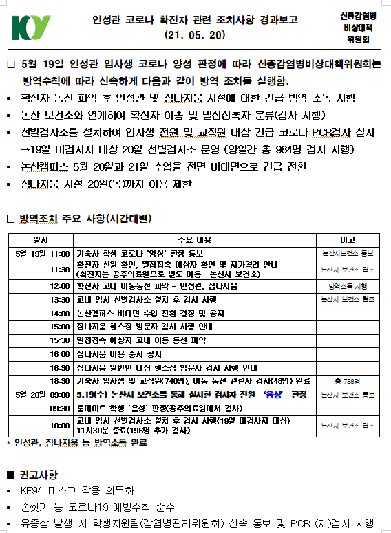 | 제목 | 논산캠퍼스 인성관 코로나19 확진에 따른 대학 조치 결과 안내 | ||||