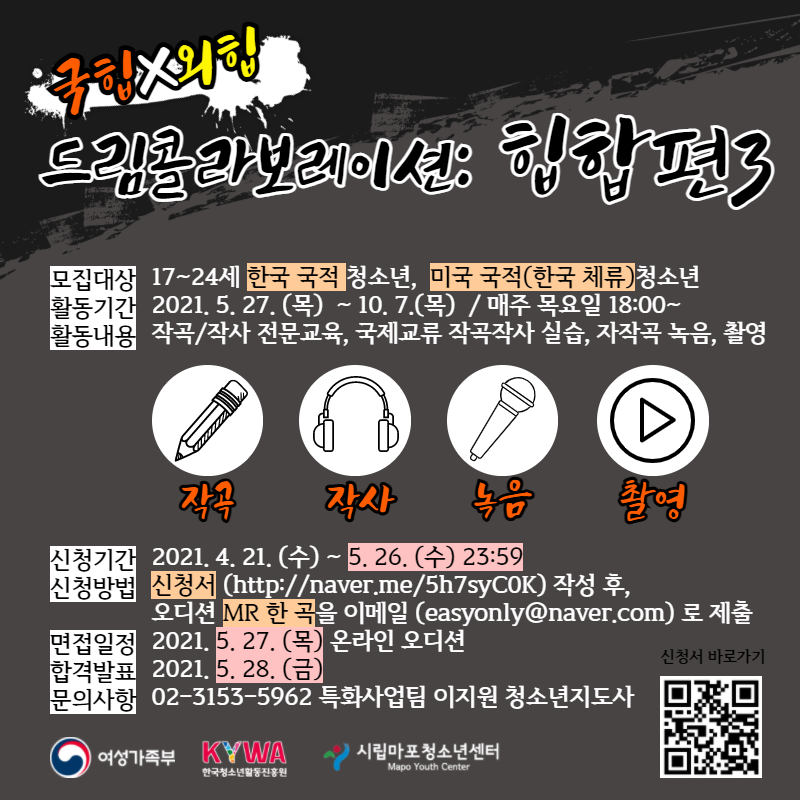 | 제목 | [시립마포청소년센터]2021 국힙X외힙 드림콜라보레이션 국제교류편 참여청소년 모집 안내 | ||||