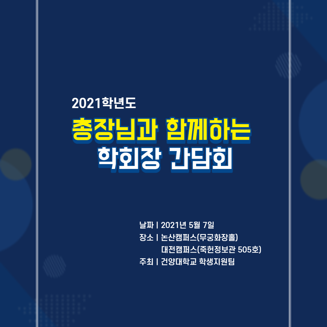 | 제목 | 2021학년도 총장님과 함께하는 학회장 간담회 안내 | ||||