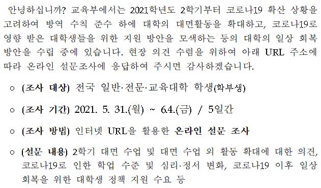 | 제목 | [교육부] 코로나19 관련 대학생 생활 현황 및 정책 지원 수요 설문조사 안내 | ||||