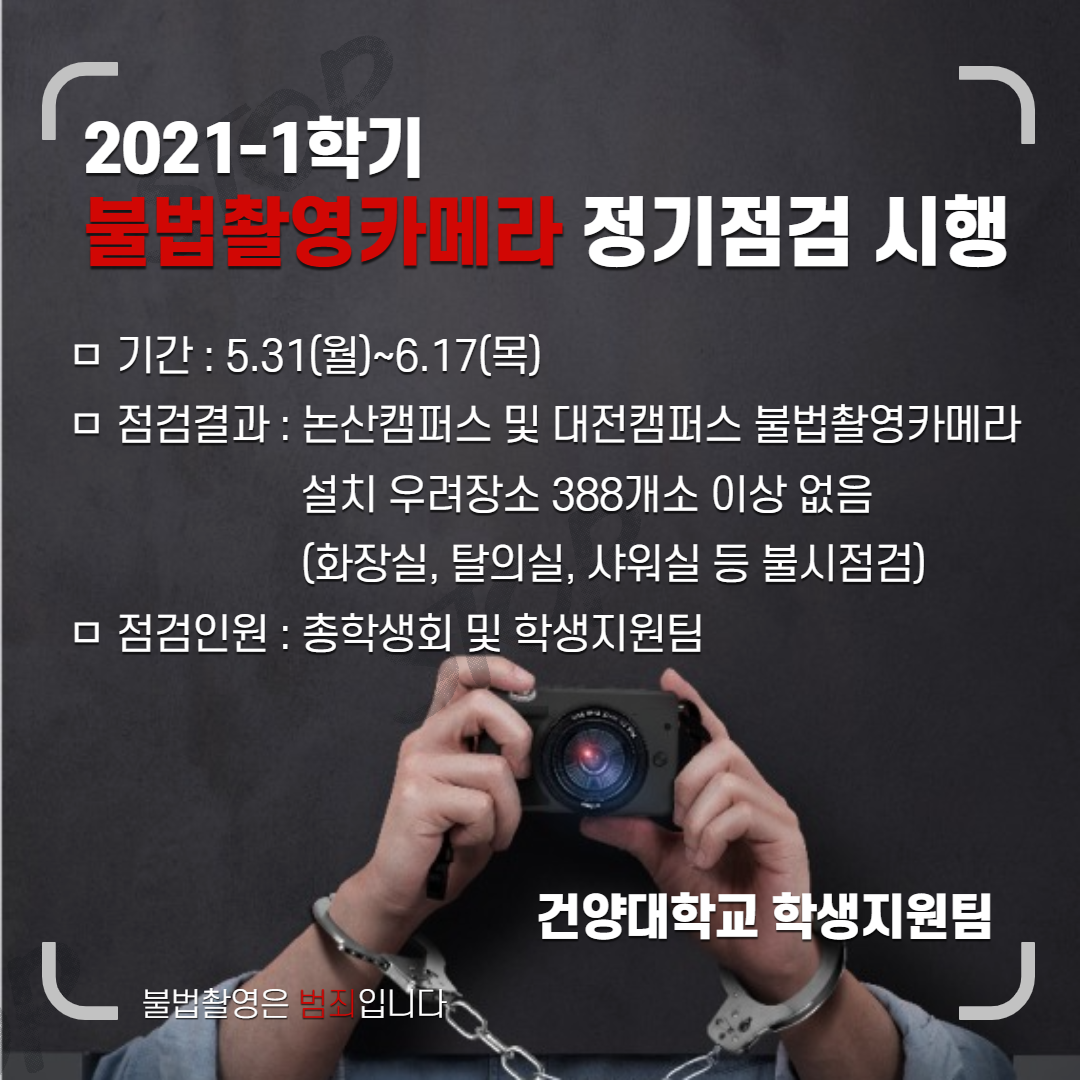 | 제목 | 2021-1학기 불법촬영카메라 설치여부 정기점검 시행안내 | ||||
