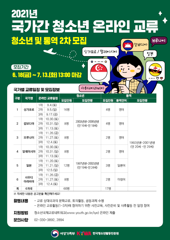| 제목 | 2021년 국가간 청소년 온라인교류 청소년 참가자 및 통역 2차 모집 안내 | ||||