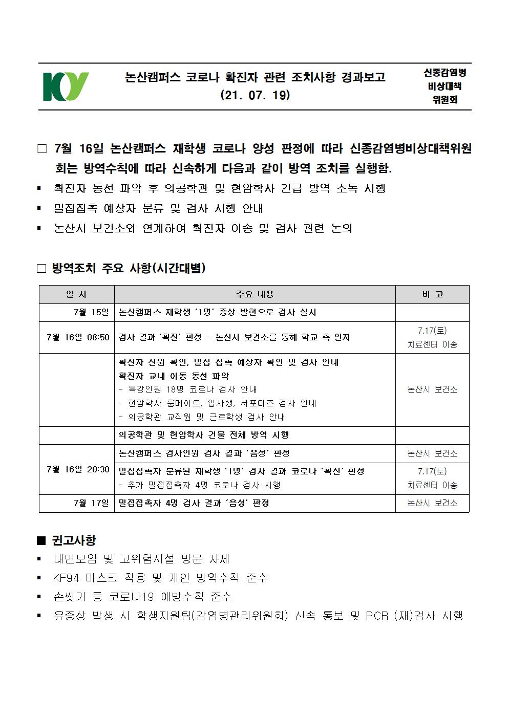 | 제목 | 논산캠퍼스 코로나 확진자 관련 조치사항 경과보고 | ||||