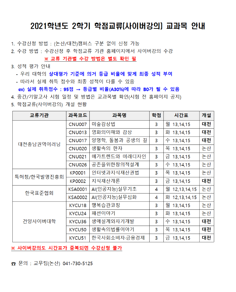 | 제목 | 2021학년도 2학기 학점교류(사이버강의) 교과목 안내 | ||||