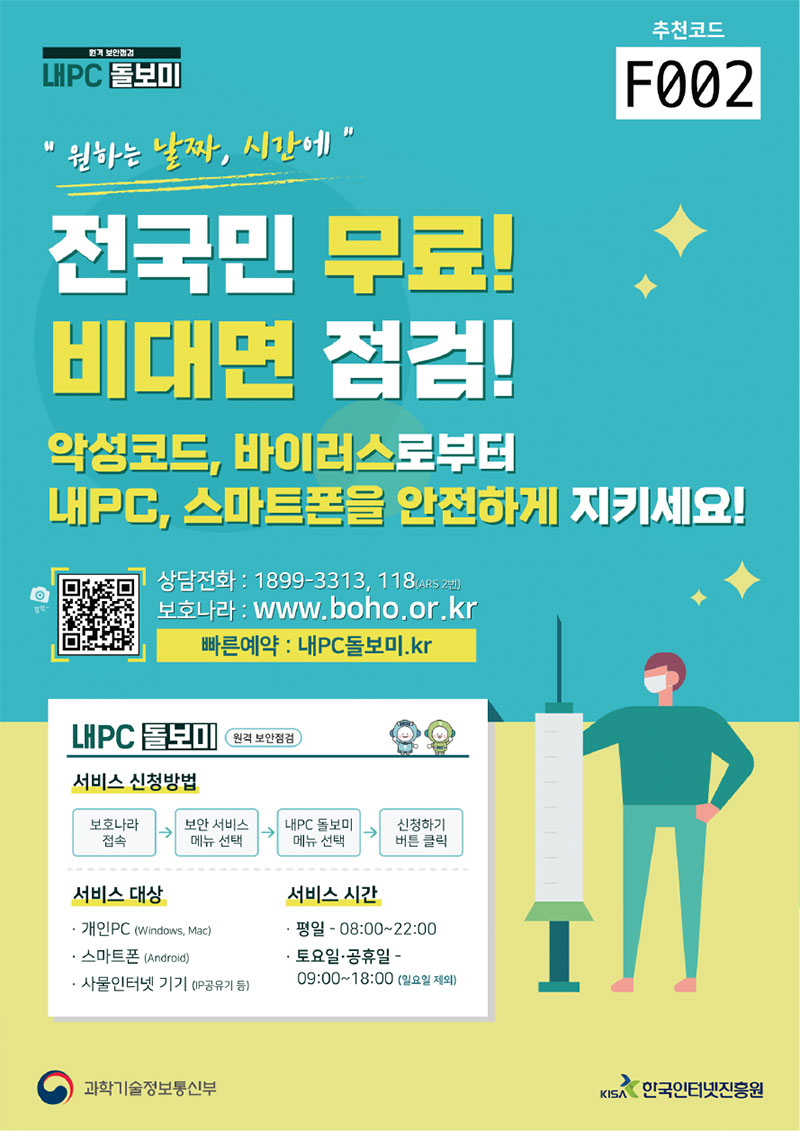 | 제목 | 과기부 한국인터넷진흥원 원격 보안점검 내PC 돌보미 지원 안내 | ||||