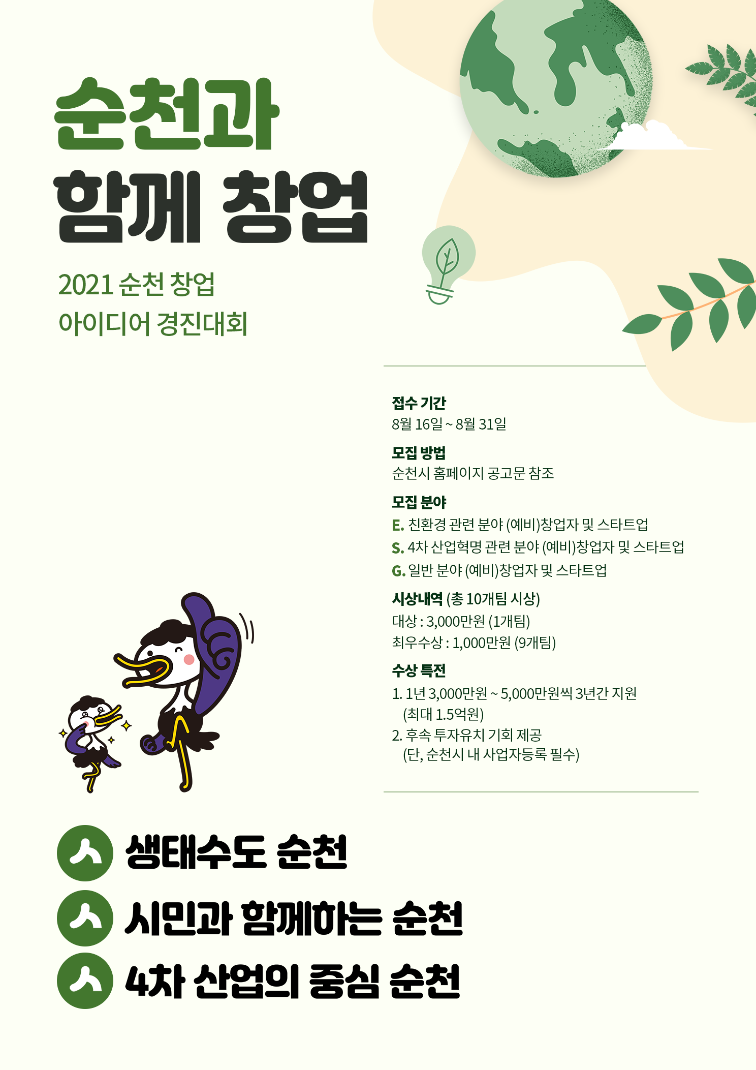 | 제목 | 2021 순천 창업 아이디어 경진대회 참가자 모집 안내 | ||||