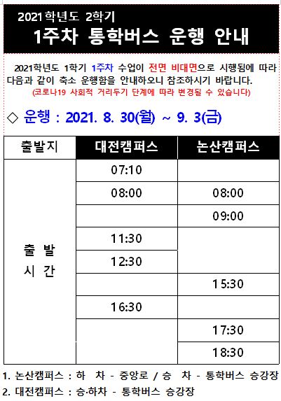 | 제목 | 2021학년도 2학기 1주차 통학버스 운행 안내 | ||||