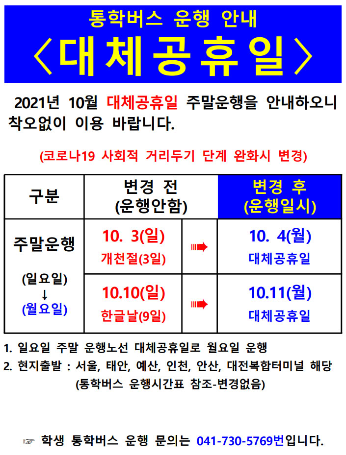 | 제목 | 대체공휴일(개천절,한글날) 통학버스 주말 운행 안내 | ||||