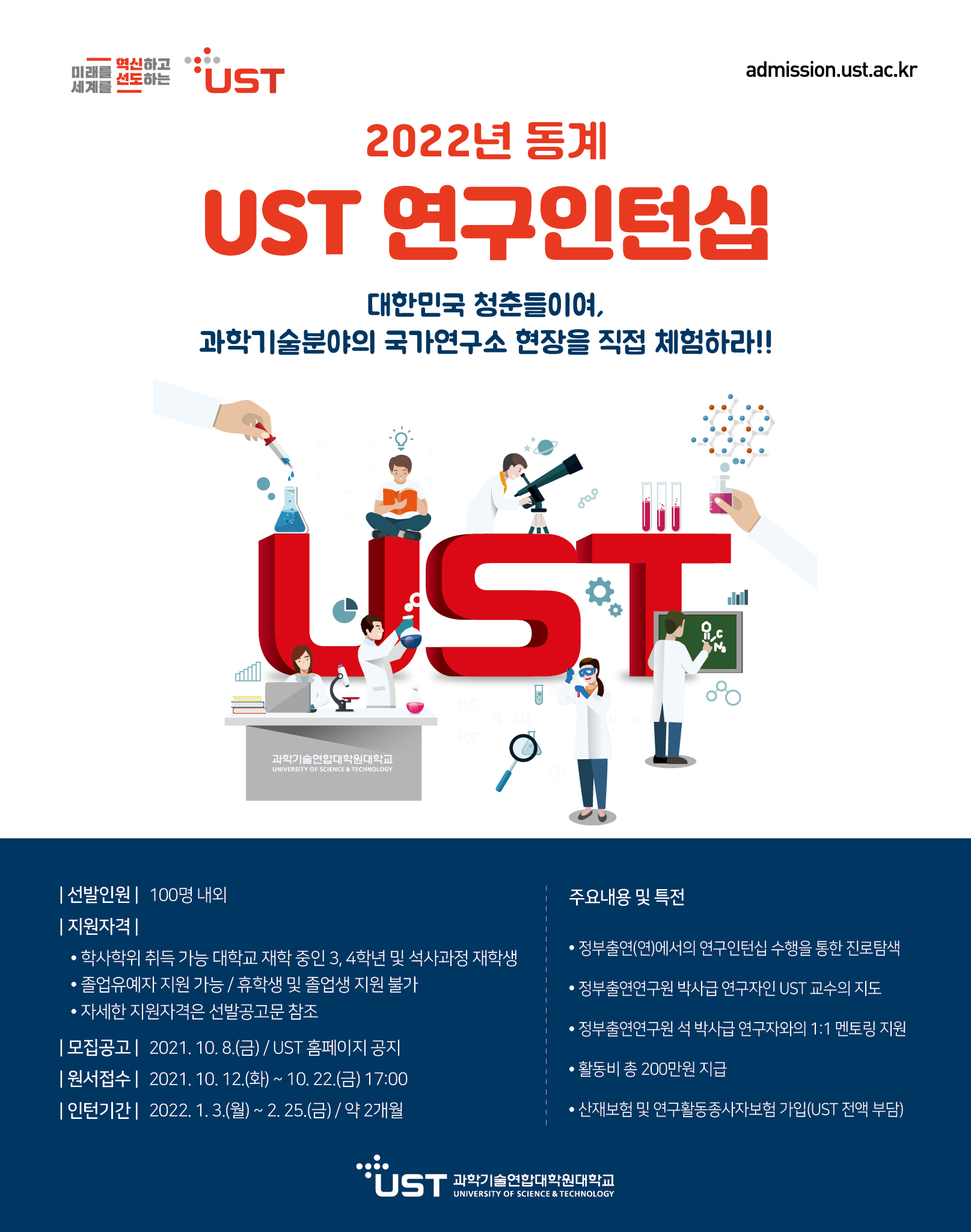 | 제목 | 2022년 동계 UST 연구인턴십 모집안내 | ||||