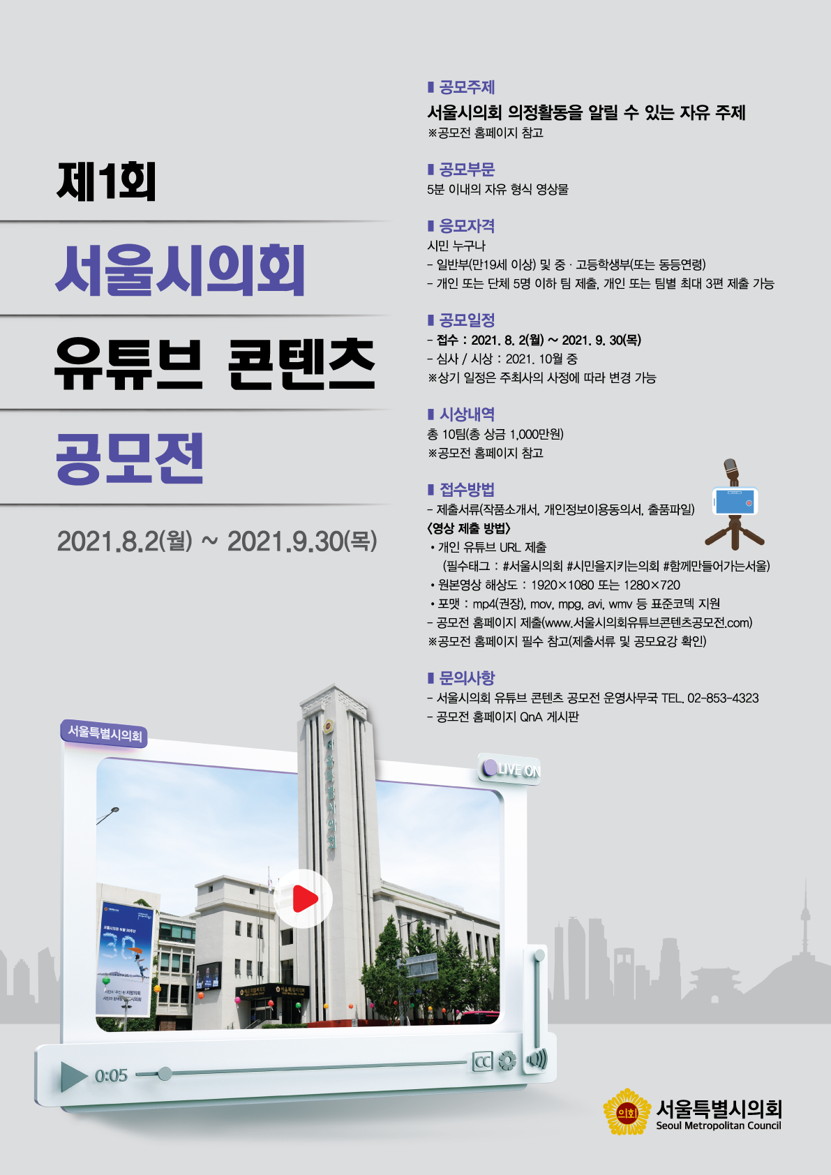 | 제목 | 제1회 서울시의회 유튜브 콘텐츠 공모전 | ||||