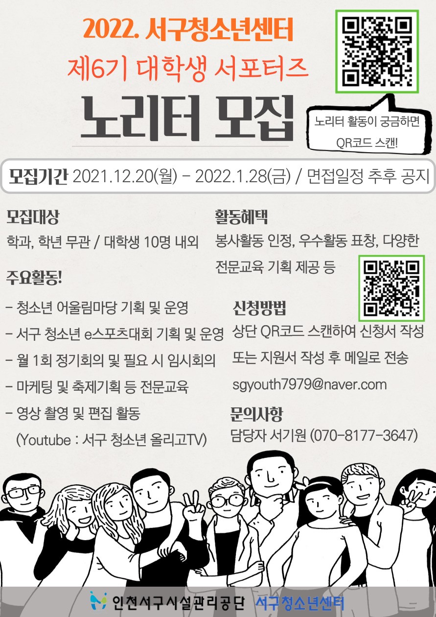 | 제목 | 인천서구청소년센터 제6기 대학생 서포터즈 「노리터」 모집 안내 | ||||