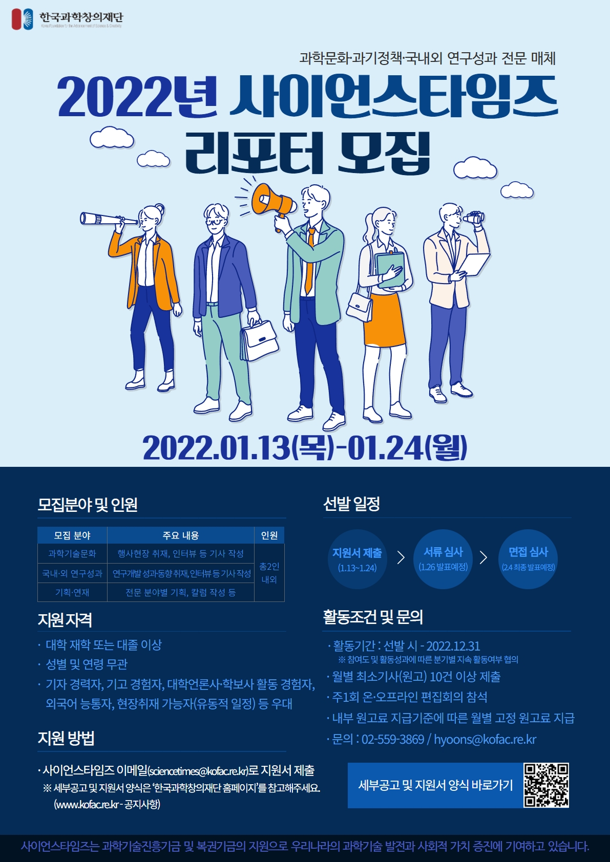 | 제목 | 2022년 사이언스타임즈 신규 리포터 모집 안내 | ||||