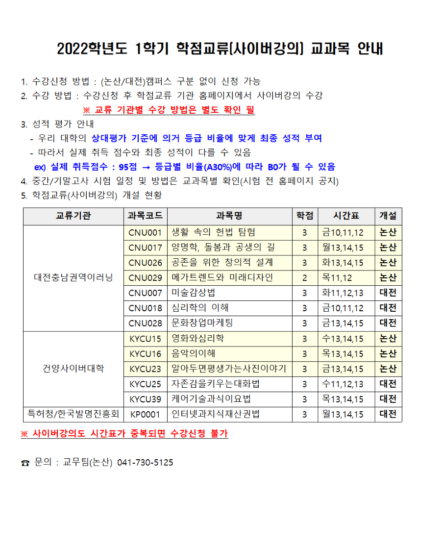 | 제목 | 2022학년도 1학기 학점교류(사이버강의) 교과목 안내 | ||||