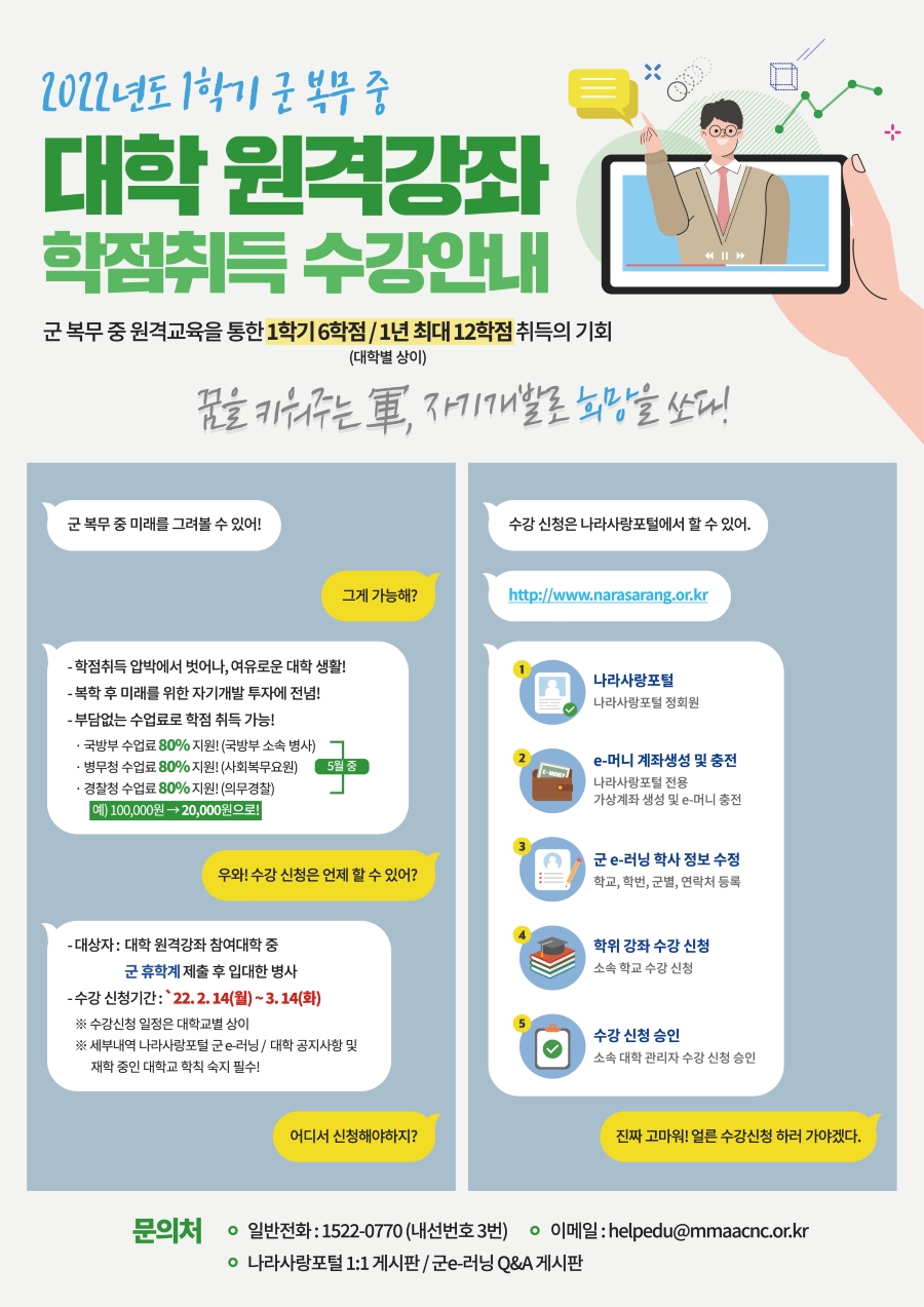 | 제목 | 2022학년도 1학기 군 복무 중 대학 원격강좌 학점취득 수강안내(군e러닝) | ||||