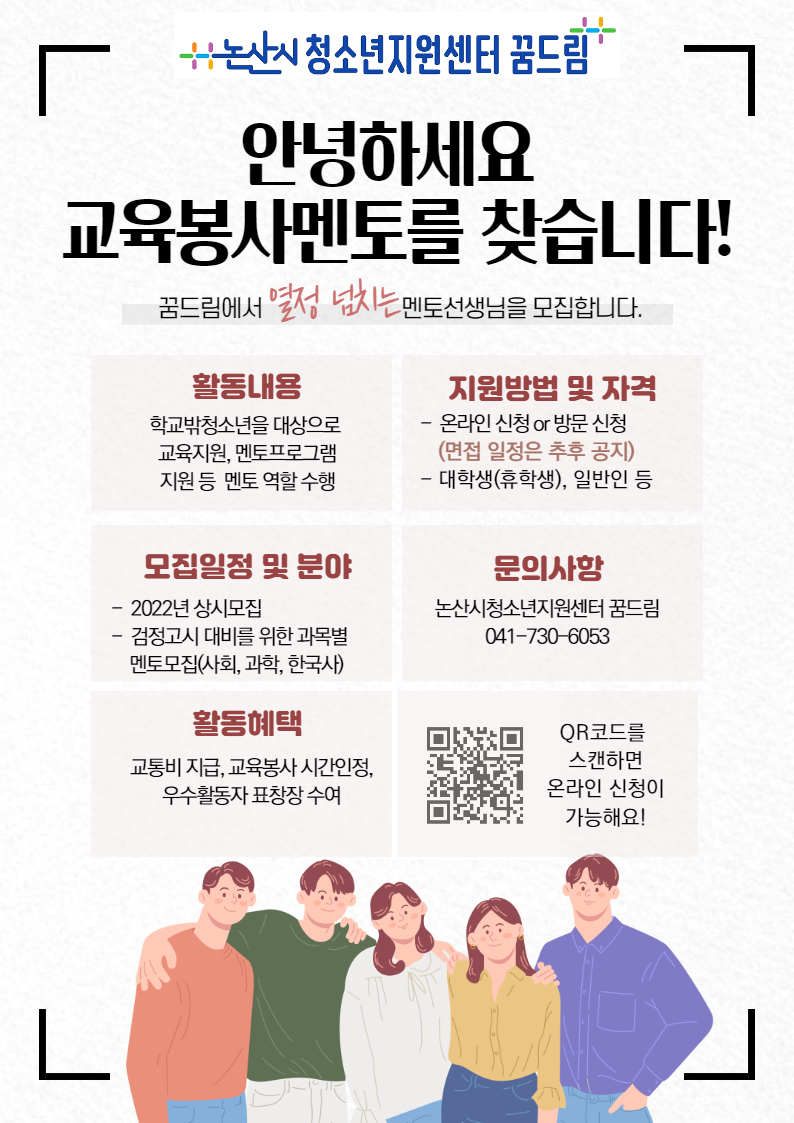 | 제목 | 2022년 논산시청소년지원센터 꿈드림 「꿈틔움멘토단」 모집 안내 | ||||