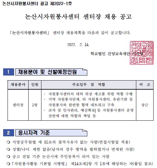 | 제목 | 논산시자원봉사센터 센터장 채용 공고 안내 | ||||