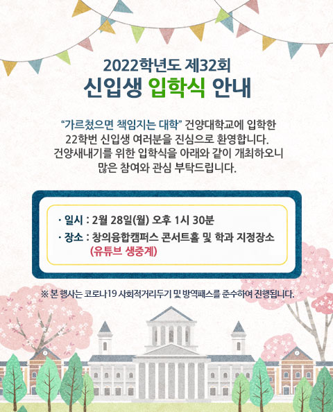 | 제목 | 2022학년도 제32회 신입생 입학식 안내 | ||||