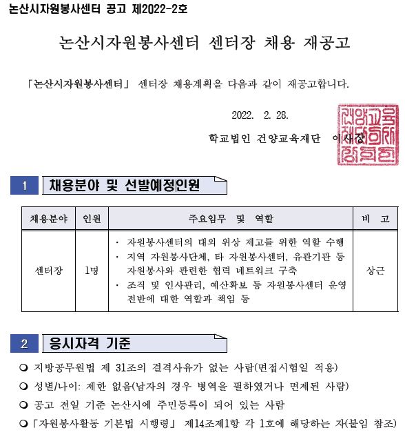 | 제목 | 논산시자원봉사센터 센터장 채용 재공고 안내 | ||||