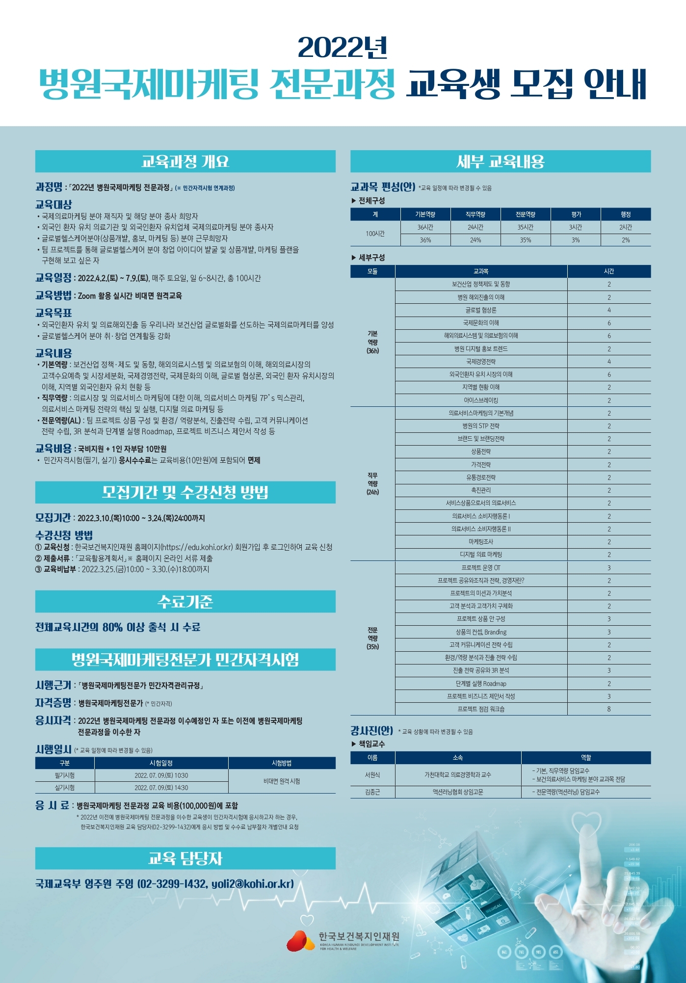 | 제목 | 2022년 병원국제마케팅 전문과정 교육생 모집 안내 | ||||