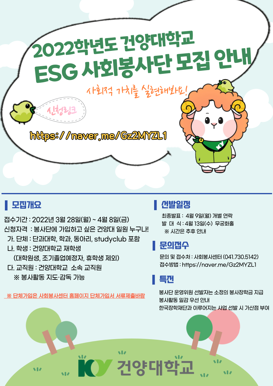 | 제목 | [사회봉사센터 안내] 2022학년도 ESG사회봉사단 단원 모집 안내 | |||||||||||||||||||