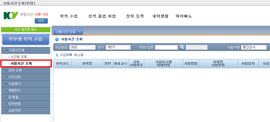 나. 유의사항 1) 수강중인 과목 중 시험 일정이 확정된 과목만 조회됩니다. 2) 조회가 되지 않는 과목에 대해서는 담당 교수님께 문의 바랍니다. 3) 시험 일정 및 고사장은 중간에 변동될 수 있으므로 시험 응시 전 최종 확인 바랍니다. 4) 학점 교류 교과목은 교류기관별 시험일정을 확인해 주시기 바랍니다.