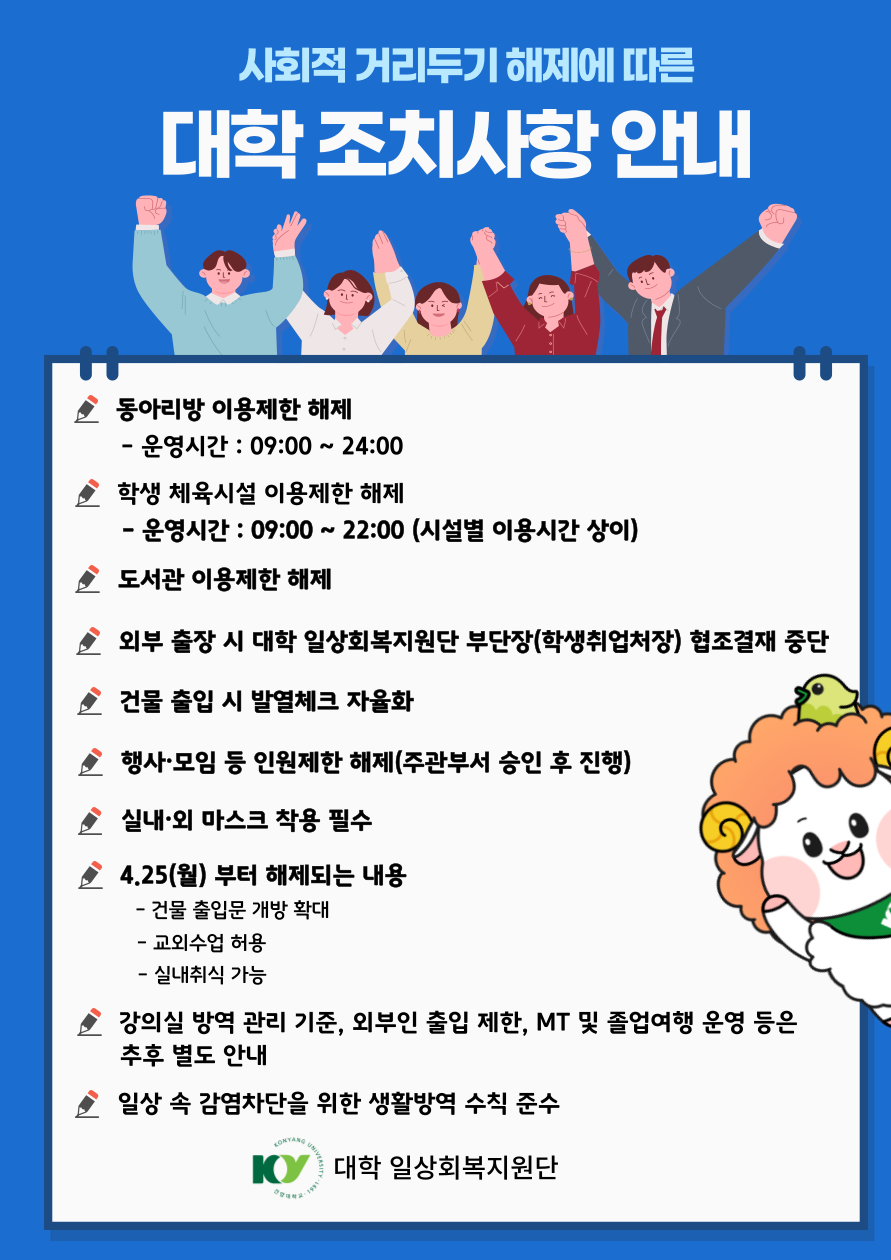 | 제목 | 사회적 거리두기 해제에 따른 대학 조치사항 안내 | ||||