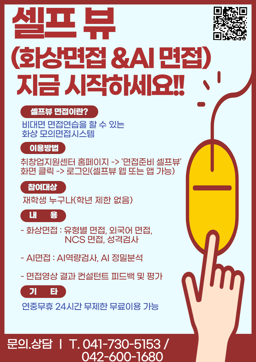 | 제목 | [취업] 2022년 셀프뷰(AI모의면접) 면접 시스템 이용 안내 | ||||