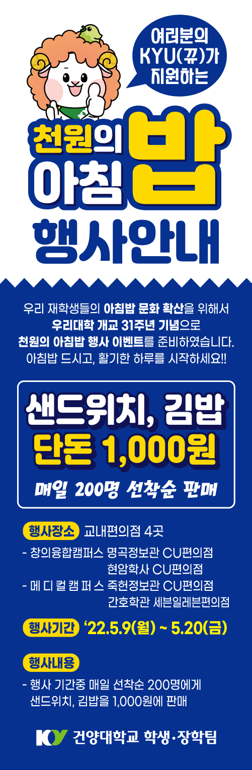 1. 행사일정 : 5.9(월)~20(금) 2. 행사내용 : 교내 편의점 김밥, 샌드위치를 매일 200명에게 선착순으로 1,000원에 판매 3. 설문조사 안내 '천원의 아침밥' 행사에 대한 우리 재학생들의 의견을 청취하고 하오니, 여러분의 소중한 의견 부탁 드립니다. 설문에 응답하신 2명을 추첨하여 소정의 선물을 드리고자 하오니, 참여 부탁 드립니다. - 설문기간 : 5.9(월)~19(목) - 설문조사 바로가기 :