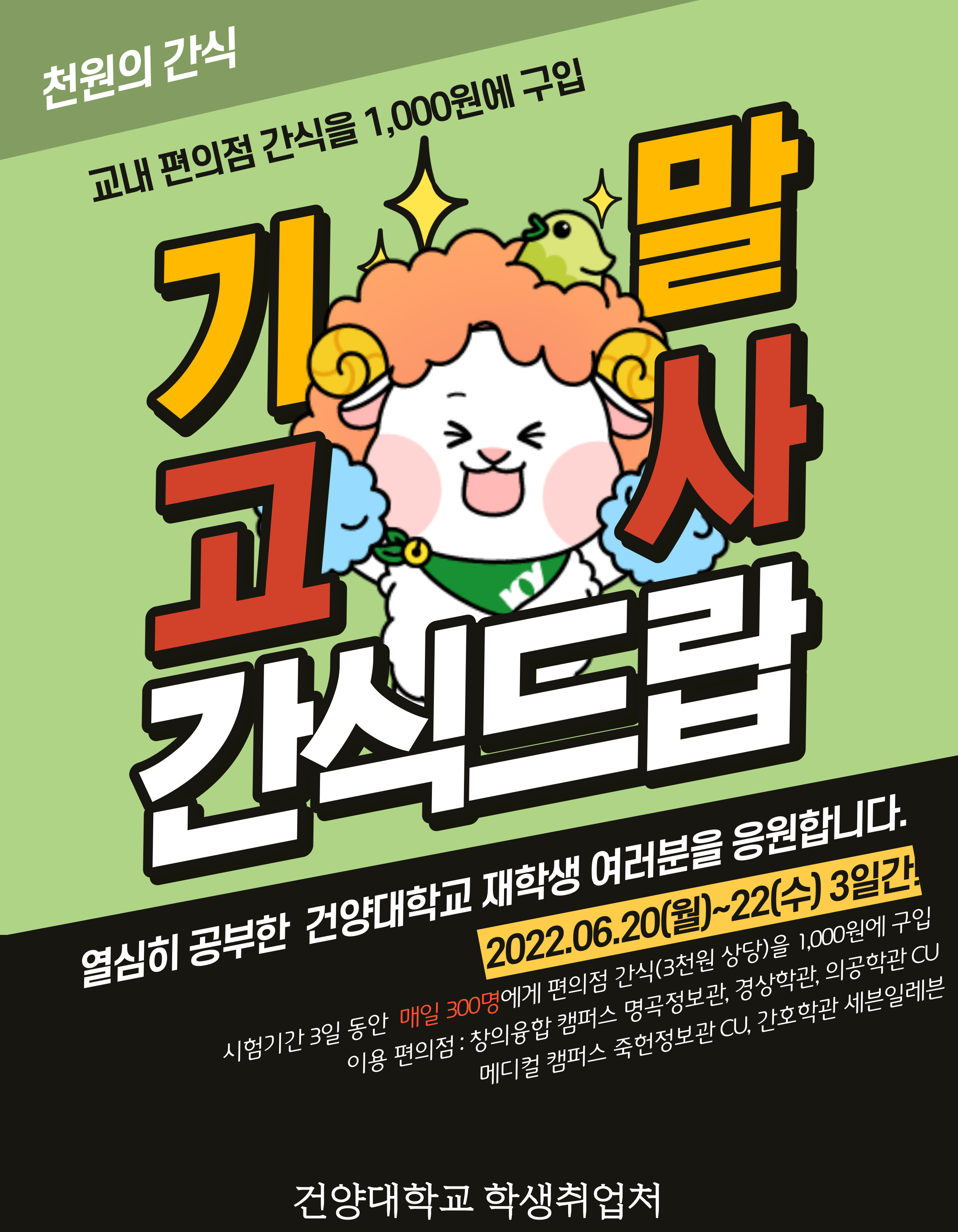 기말고사를 맞이한 건양대학교 학생들을 응원하고자 '천원의 간식'행사를 시행합니다.