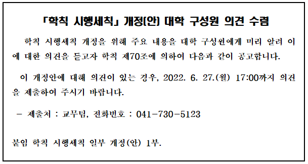 | 제목 | 학칙 시행세칙 개정(안) 관련 대학 구성원 의견 수렴 안내 | ||||