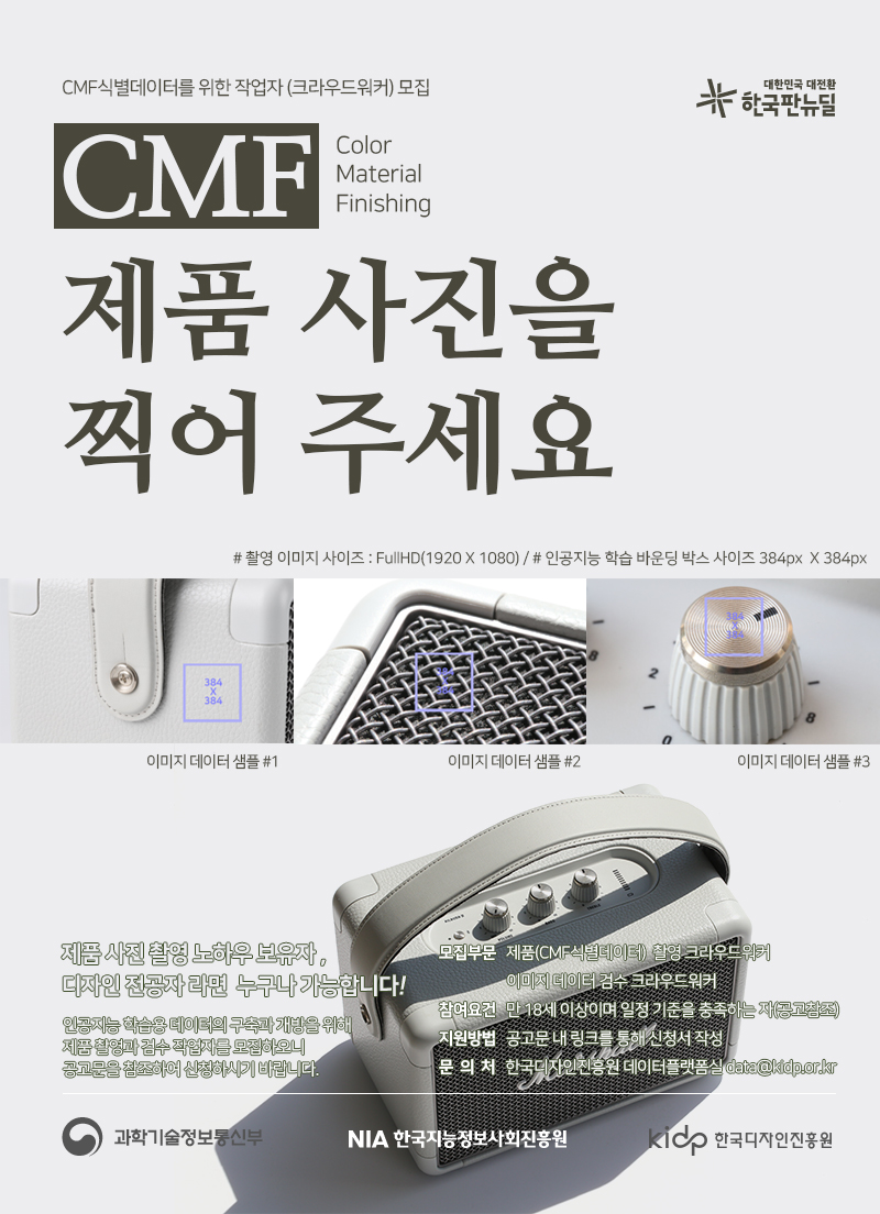 | 제목 | 인공지능학습용데이터 (CMF식별데이터) 구축사업을 위한 크라우드워커 모집 안내 | ||||