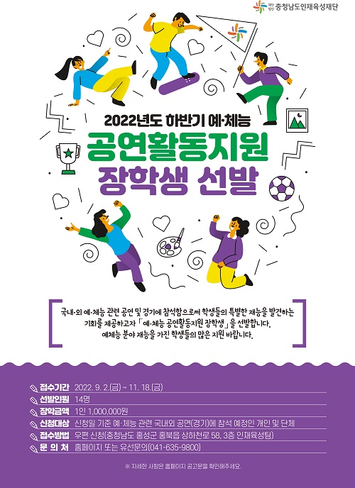 | 제목 | 2022년도 하반기 충청남도인재육성재단 "예체능공연활동지원 장학생" 선발 안내 | ||||