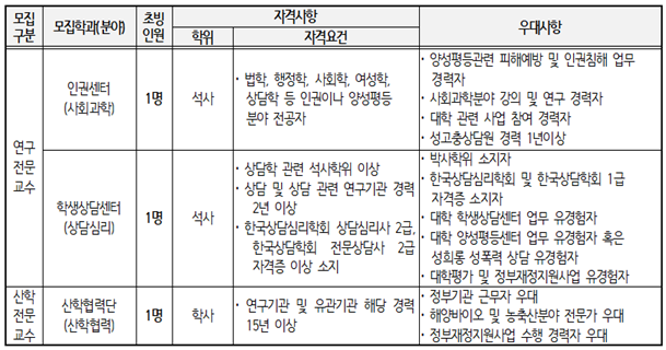 ※ 세부내용은 첨부된 공고문 참조 ※ 위 사항 외 기타 궁금하신 사항은 교원인사팀(☎041-730-5118)으로 연락 주시기 바랍니다. 감사합니다. |