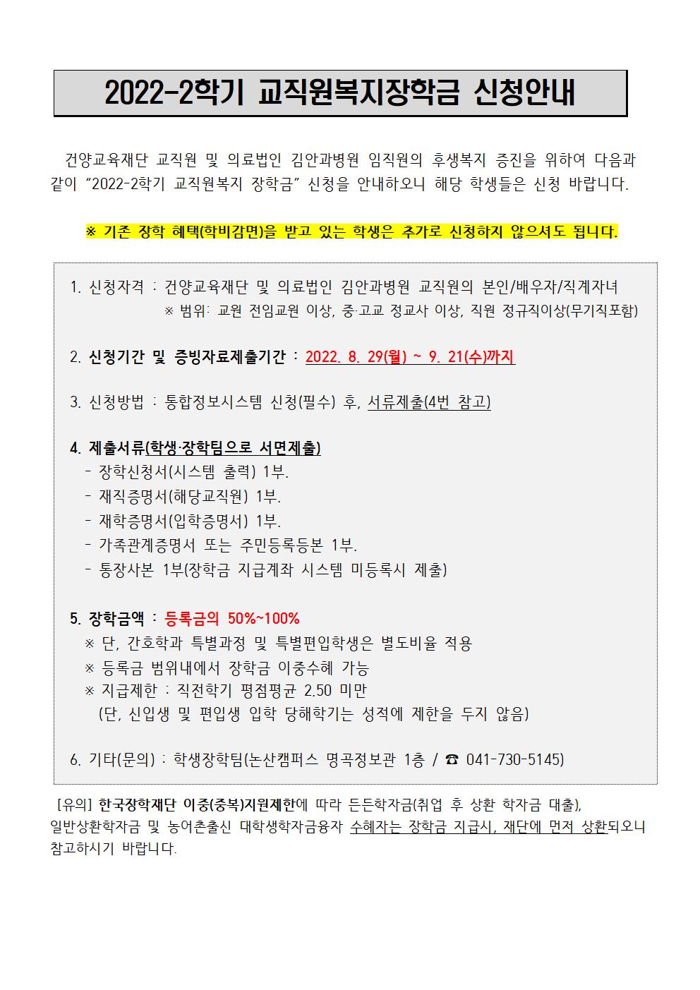| 제목 | 2022-2학기 교직원복지장학금 신청안내(신규자) | ||||