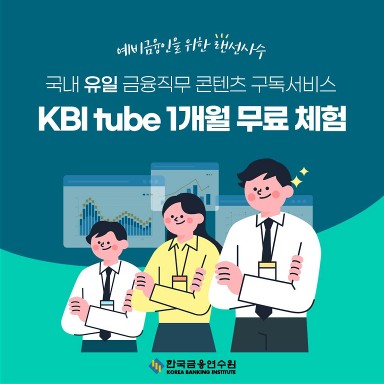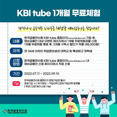 | 제목 | 예비금융인 대상「KBI tube 서비스 무료 체험 및 할인 혜택」제공 안내 | ||||