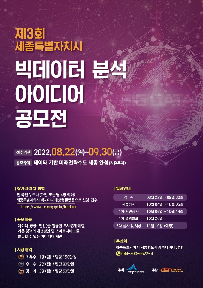 | 제목 | 제3회 세종특별자치시 빅데이터 분석 아이디어 공모전 안내 | ||||