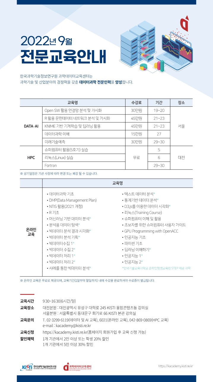 | 제목 | 한국과학기술정보연구원(KISTI) 2022년 9월 전문교육 운영 안내 | ||||