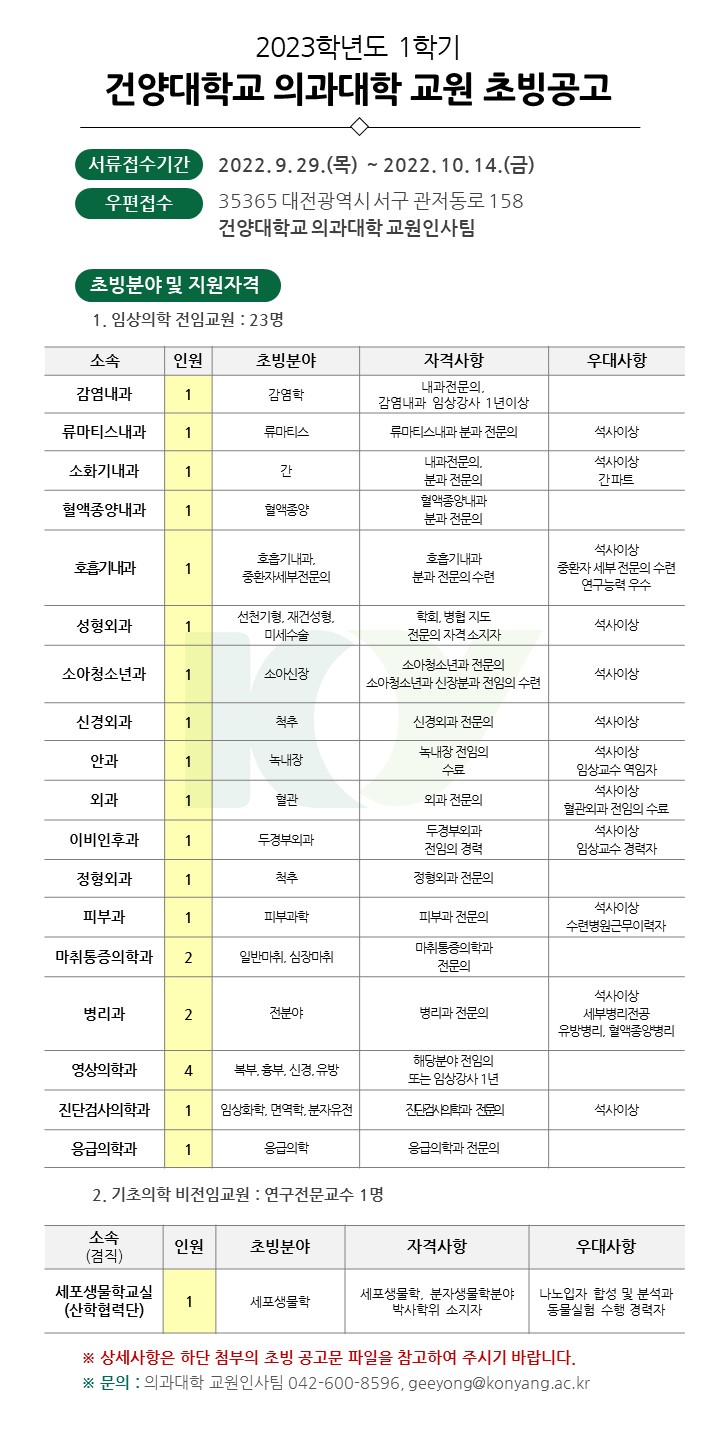 | 제목 | 2023학년도 1학기 건양대학교 의과대학 교원 초빙공고 | ||||
