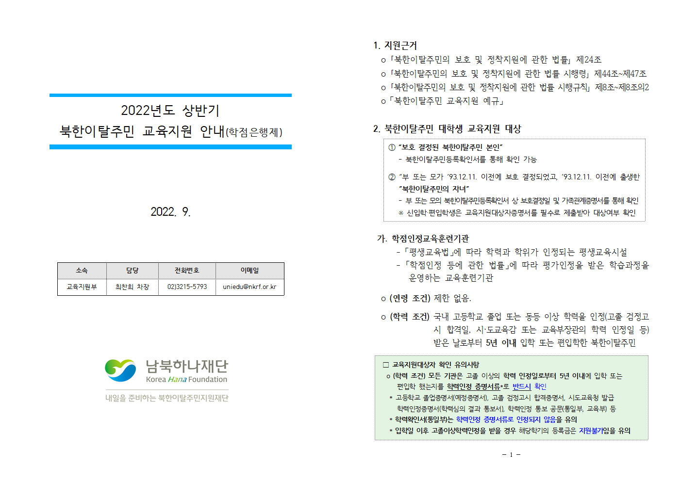 붙임1-2022년 하반기 북한이탈주민 교육지원 안내(학점은행제).hwp