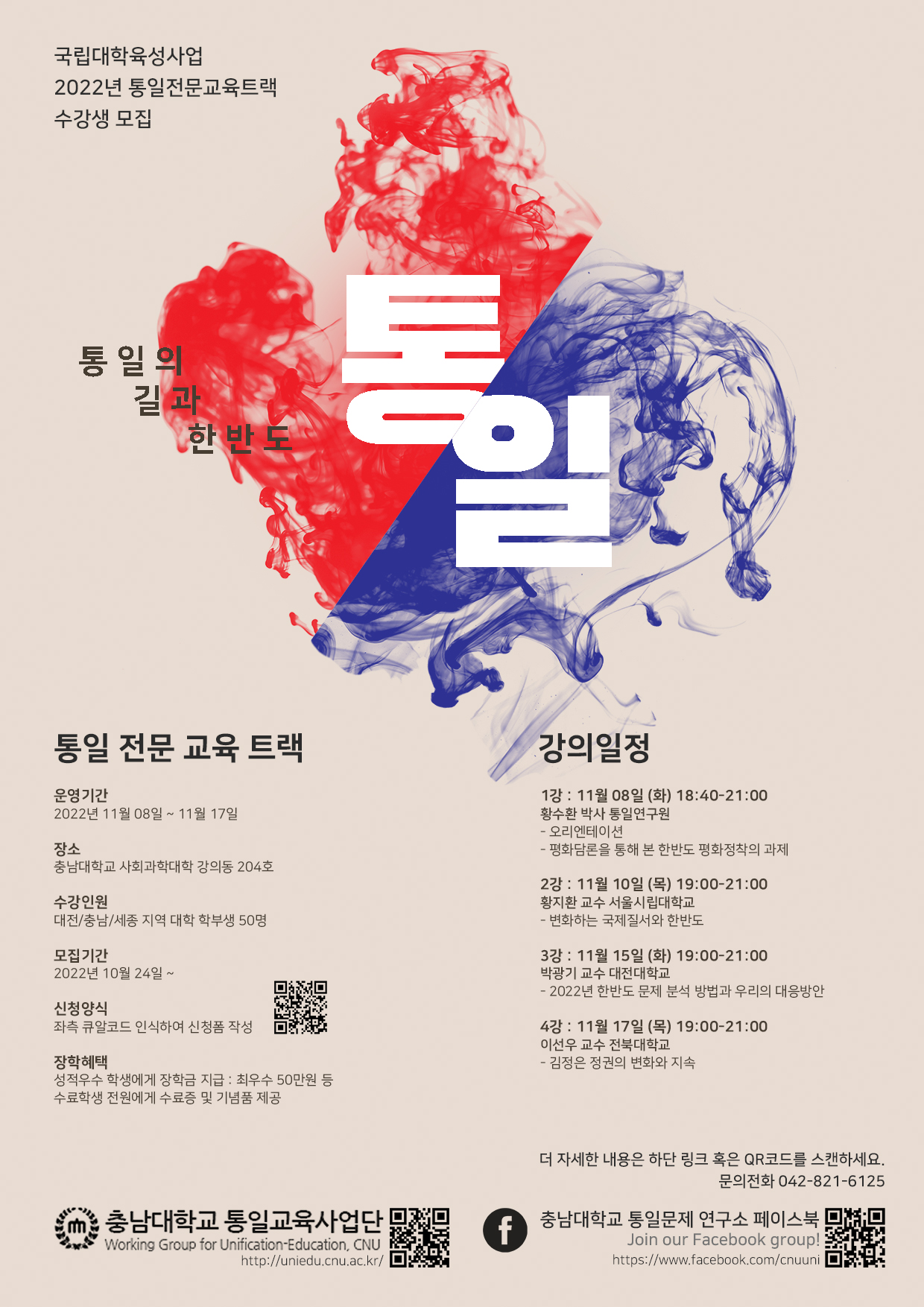 | 제목 | 충남대학교 통일전문교육트랙“통일의 길과 한반도”수강생 모집 홍보안내 | ||||